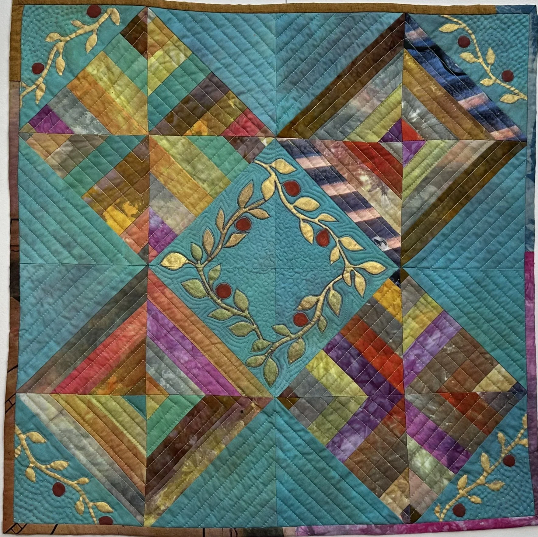 This colourful little quilt features strip patchwork using hand dyed cotton fabrics with hand painted garlands of leaves and berries. It combines free motion and guided machine quilting with hand quilting at the corners. It would make an ideal centrepiece for a table or sideboard.